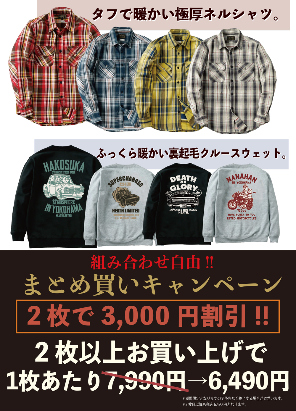 12/13(土)より、HEATH/BLUEPORT各店では人気のネルシャツと新作の裏起毛クルースウェットシリーズをおまとめ買いで3000円オフになるキャンペーンを実施します!